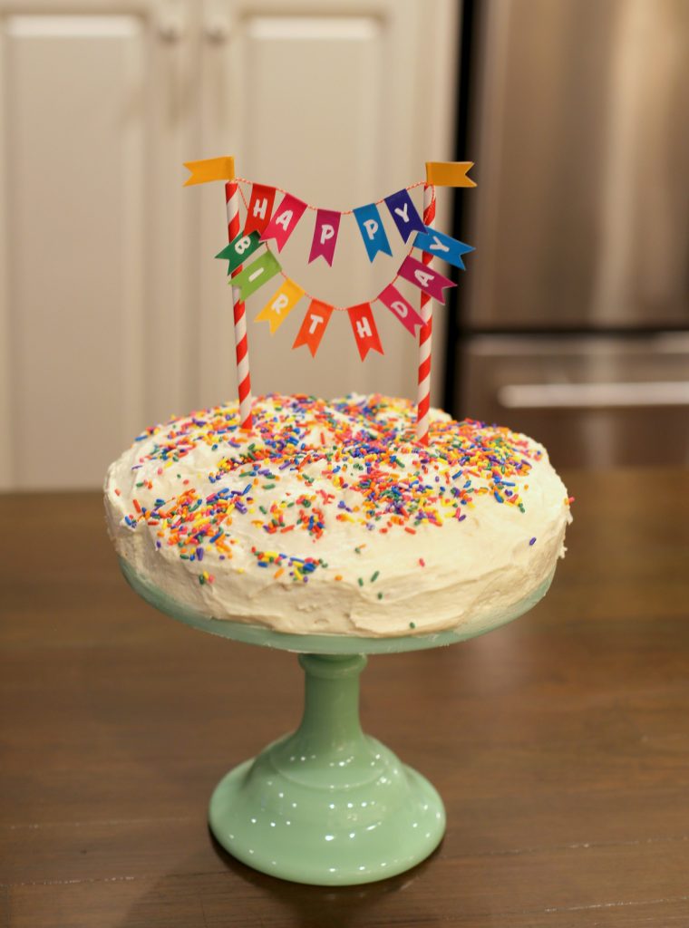 He requested vanilla cake with white icing and sprinkles! It was actually just a box mix cake topped with homemade buttercream! 🙂