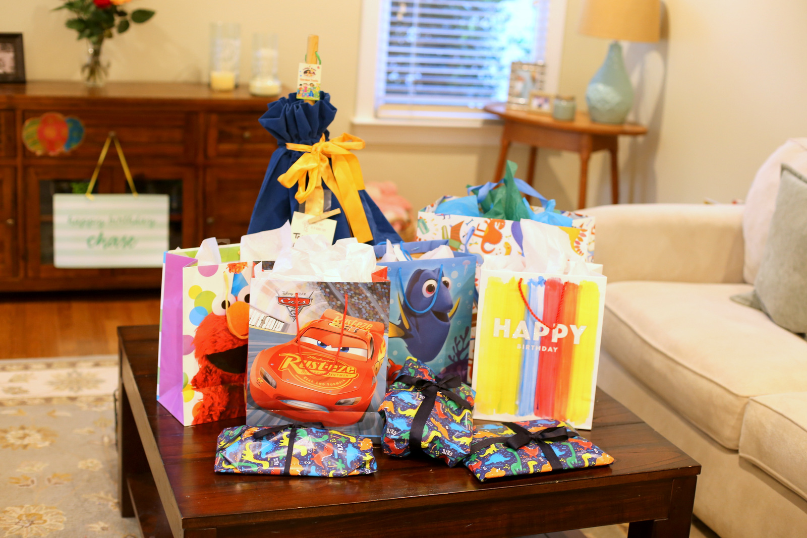 When my sister and I were little, my mom would always decorate our place at the kitchen table on our birthdays which felt like such a special treat so I took a page out of my mom’s book and blew up some balloons, hung streamers and placed Chase’s presents on the coffee table for him to find after he woke up in the morning. We actually saved a bunch of the presents from Chase’s party (we said no gifts were necessary but people were still very generous) for him to open so he was very surprised!