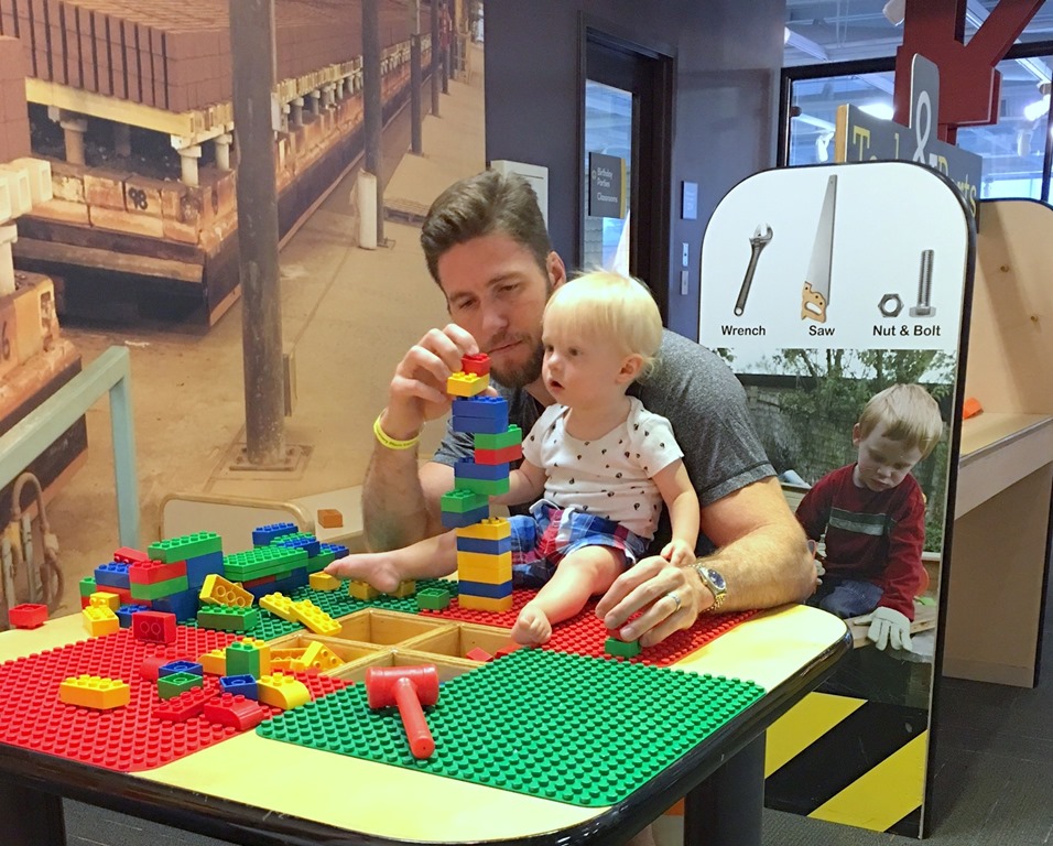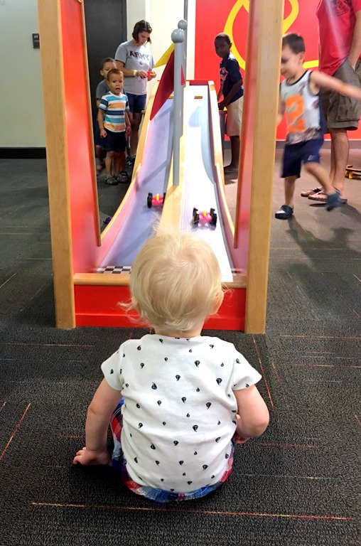By the time we hit up the grocery store, popped into Target and made our way home, Chase was back up again and Ryan suggested a family outing to Discovery Place KIDS which sounded fantastic! We haven’t been to DPK in a while, so it was neat to see how much Chase has changed since his last visit. He had a great time crawling all over the large foam shapes, watching the big kids race cars and banging Legos together.