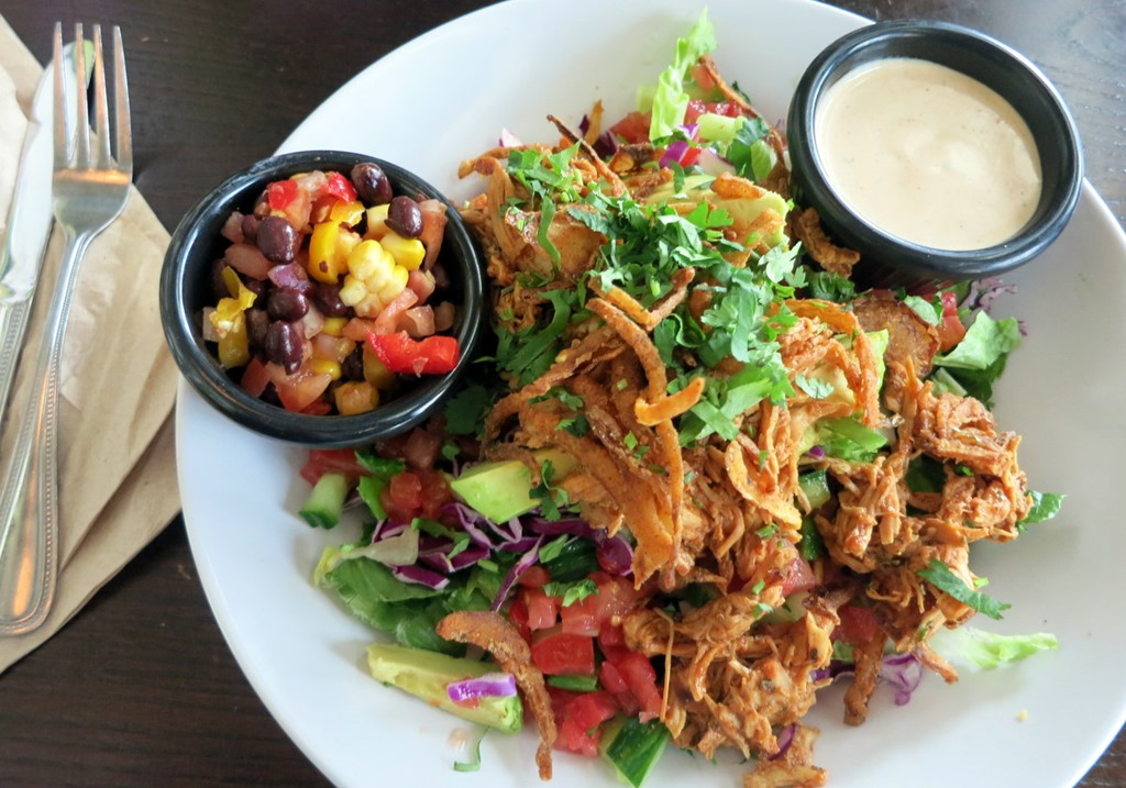 I ordered the “Cue” chopped chicken salad and it came with barbeque pulled chicken, avocado (I think there was almost a full avocado under all the toppings!), crispy onions (my favorite), cabbage, tomatoes and a black bean and corn slaw. I requested the barbeque ranch dressing on the side and lightly drizzled it over everything before digging in.