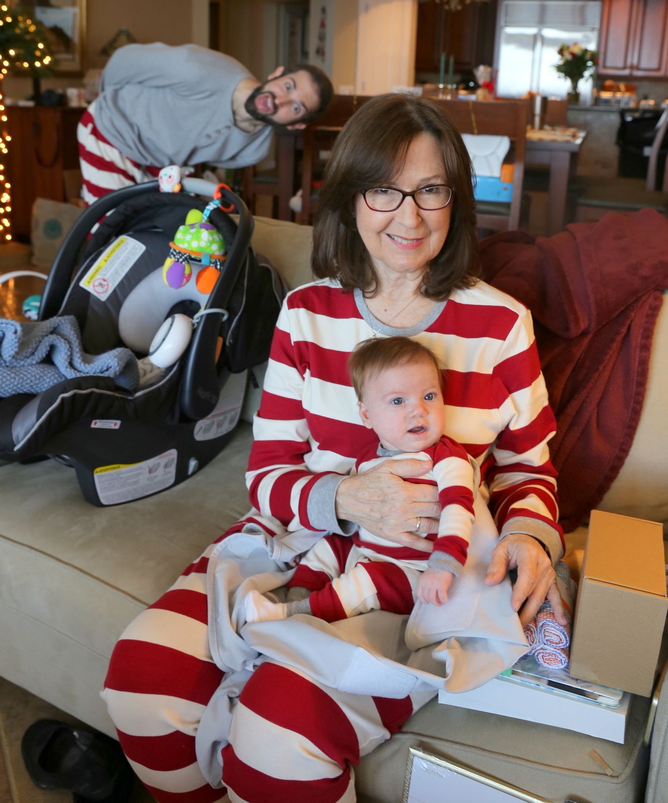 My brother-in-law’s mother, Susan, joined our gang (matching pajamas and all — she’s such a good sport) and arrived at my parents’ place with Leslie, Ross, Callie and Kona (their chocolate lab) a little after 8 a.m.