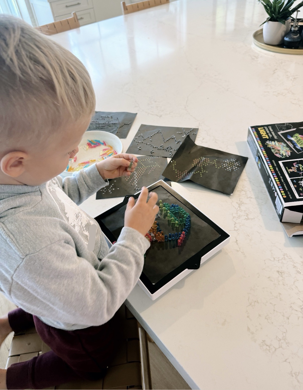 Once the boys were up and fed, Rhett and I said goodbye to the big kids and Ryan as they headed out the door. Since Ryan handled Chase and Ryder’s school drop off today, this morning felt less rushed all around for me and Rhett which was wonderful. I started on this blog post while Rhett worked on his Lite Brite creation next to me until it was time to head out the door for his preschool drop-off. (Anyone else love Lite Brite as a kid? It’s one of those toys from my childhood that definitely holds up with the boys, too!)