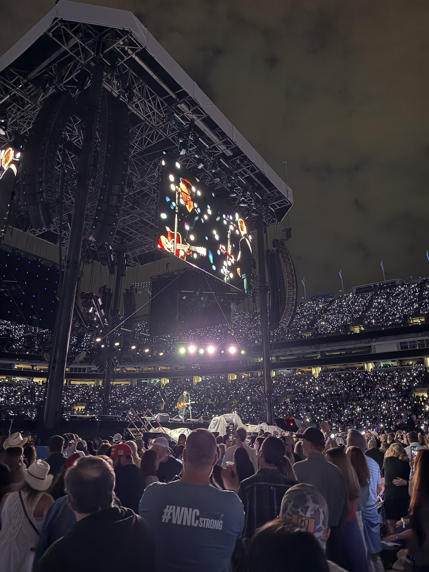 Concert for Carolina was organized in less than 30 days by country music superstars Luke Combs and Eric Church and included a fantastic lineup of country music artists. James Taylor, Keith Urban (it was his birthday and his wife Nicole Kidman came on stage and we all sang to him!), Sheryl Crow, Chase Rice, Billy Strings and Scotty McCreery and a few additoinal artists all came together for one purpose: To raise money for Hurricane Helene relief in the Carolinas. And man oh man was it a success! The concert raised more tha $24.5 million dollars (!!!) and lasted well past midnight. It seemed like every dollar spent that evening was going toward Hurricane Helene relief — our drinks, parking fees, food, merchandise purchases, additional donations… everything.