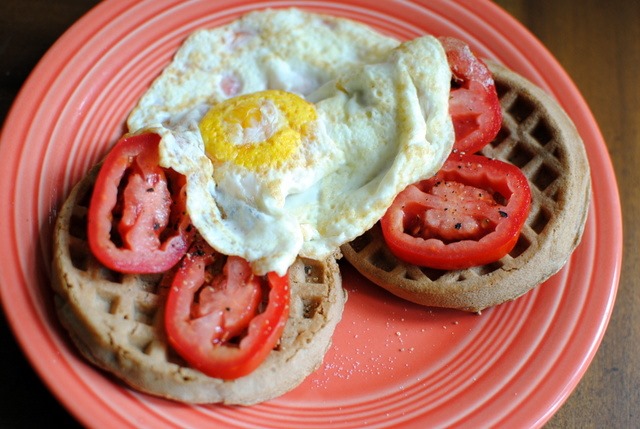 Today’s morning meal included two wheat waffles topped with tomato slices, salt and pepper and a dippy egg.