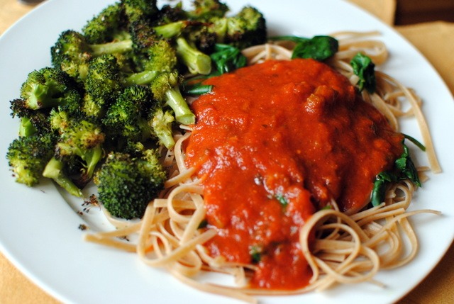 Yesterday I spent most of the day with my father-in-law. We drove around town sightseeing, took Sadie on a nice walk and then I made dinner at home. I made whole wheat linguine topped with steamed spinach and marinara sauce and served it with a side of roasted broccoli so Ryan, Greg and I could enjoy a cozy night indoors.