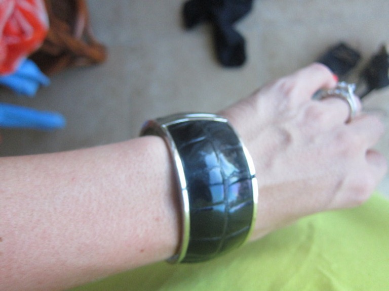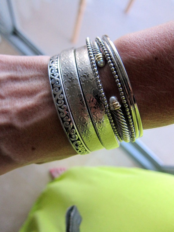 I am dying to see a picture of the back of the dress! Very nice, and I love your bracelets.