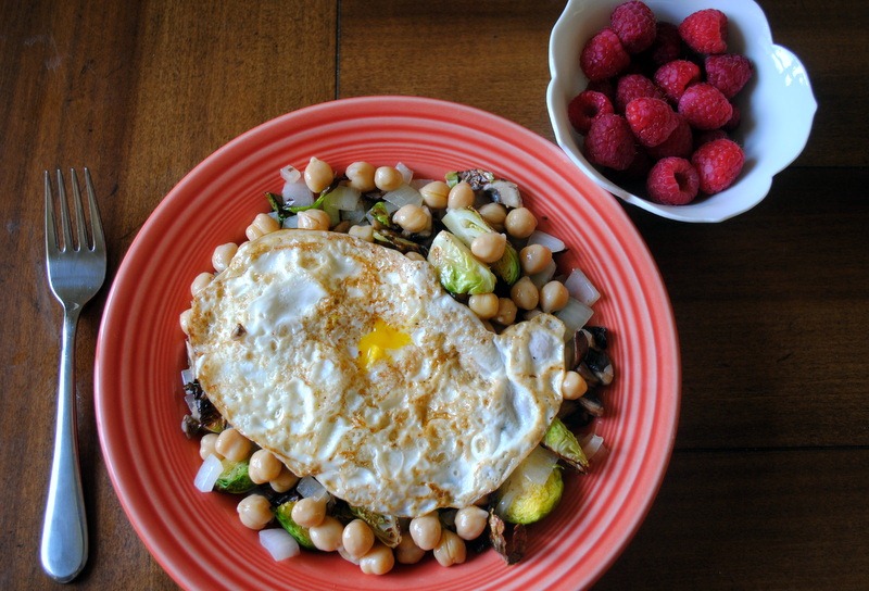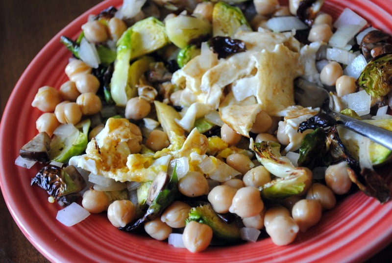 While roasting Brussels sprouts, I sautéed about a quarter of a sliced onion with a chopped portobello mushroom and mixed everything together with chickpeas and a dippy egg.