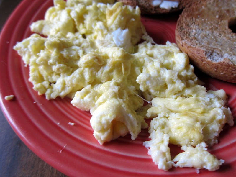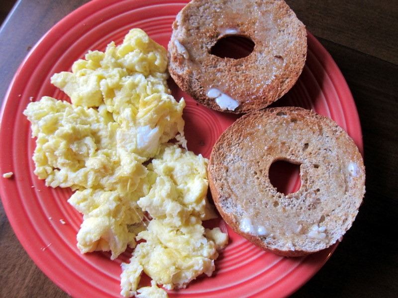 Today’s morning meal included scrambled eggs made with two eggs, lots of shredded mozzarella cheese and milk…