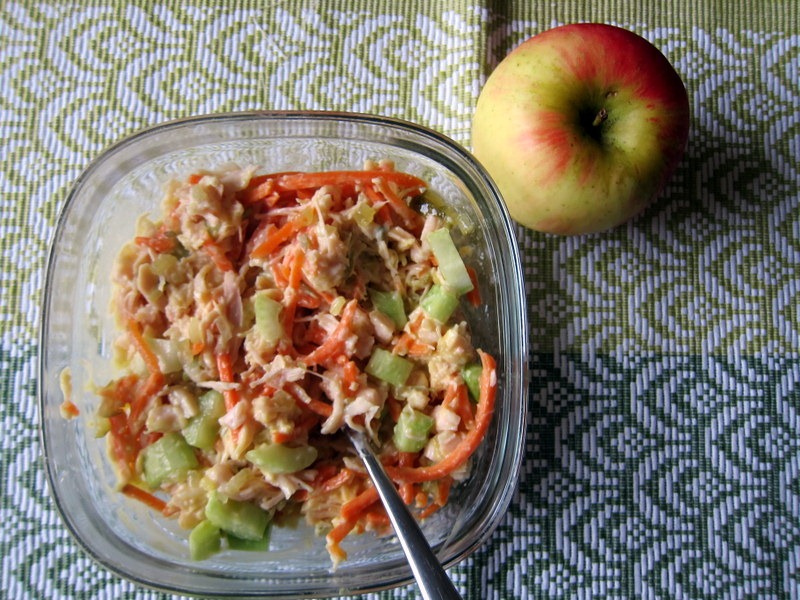 I made myself chicken salad with celery, white corn and carrots and ate it with a giant Honeycrisp apple on the side.