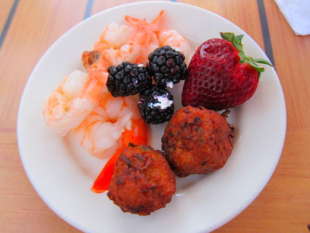 I had a glass of Riesling and a plate filled with shrimp, some kind of fritters and fresh berries. I also had some goat cheese and a delicious kind of cheese that seemed to have some kind of a raspberry ribbon running through it, but my cheese plate was demolished before I snapped a picture.