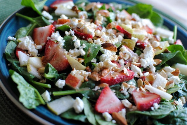 Yes definitely!! I am actually planning to do a round up post of summertime side dishes so it will be in that post in more detail! But it was just a base of the spinach topped with strawberries, pears, goat cheese and raw almonds!