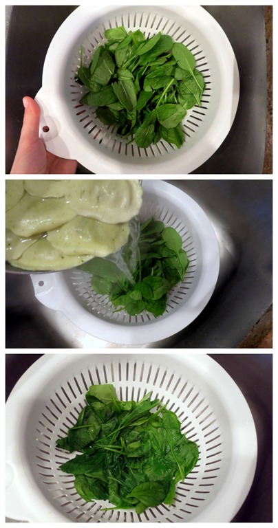Pour hot pasta water over fresh spinach and there ya go! It’s a great way to quickly wilt spinach to use in any pasta dish and takes no time at all.