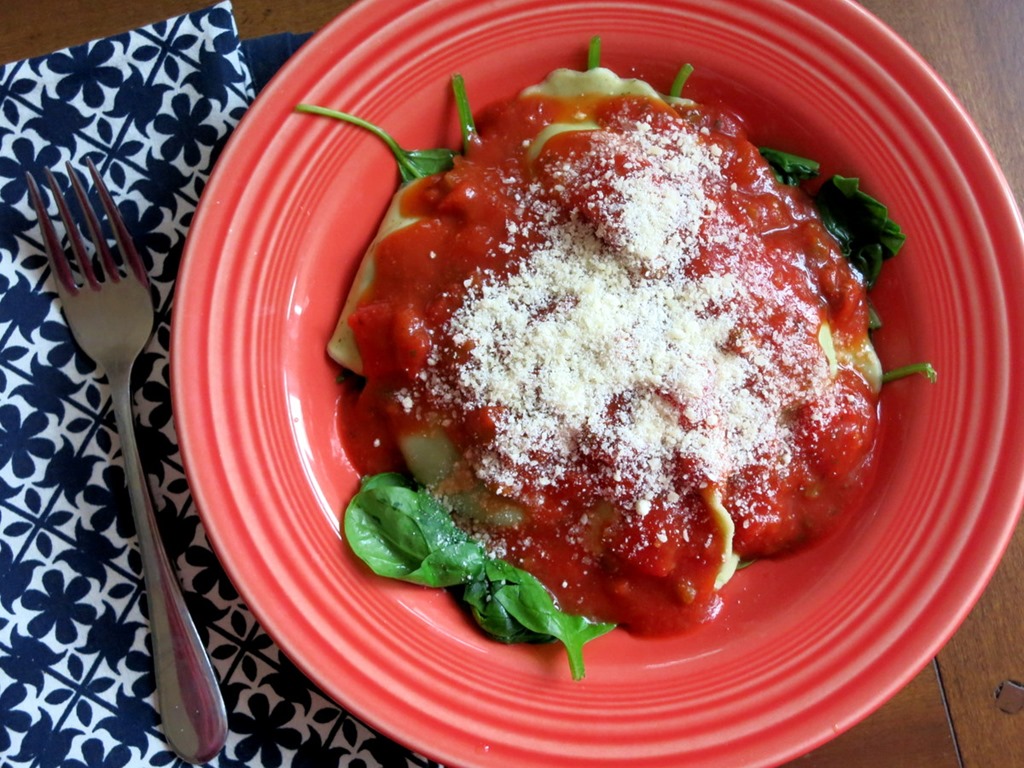 I topped a bed of wilted spinach with ravioli, marinara sauce and parmesan cheese before digging in.