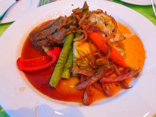 The entrée included teriyaki glazed beef filet with grilled pineapple and blue crab crusted halibut with lobster tarragon sauce, mashed potatoes, red peppers and asparagus. It was fantastic.