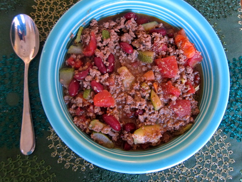 After a hot shower back at home, I got to work in the kitchen and made a big pot of my simple summer chili that I figured I could eat for lunch and dinner today. Efficiency!