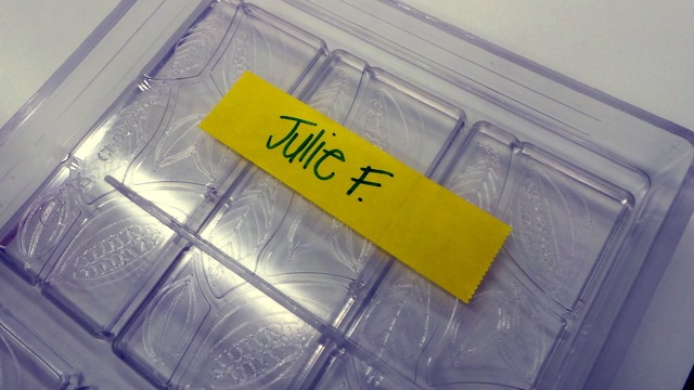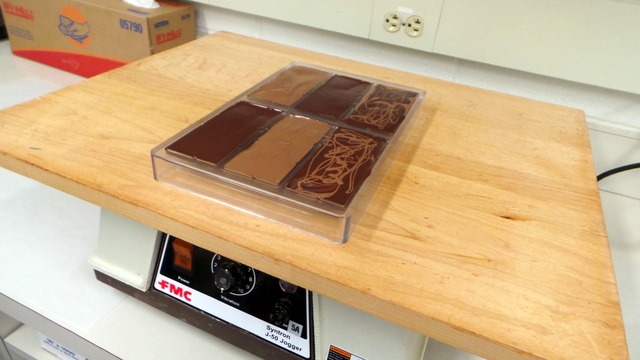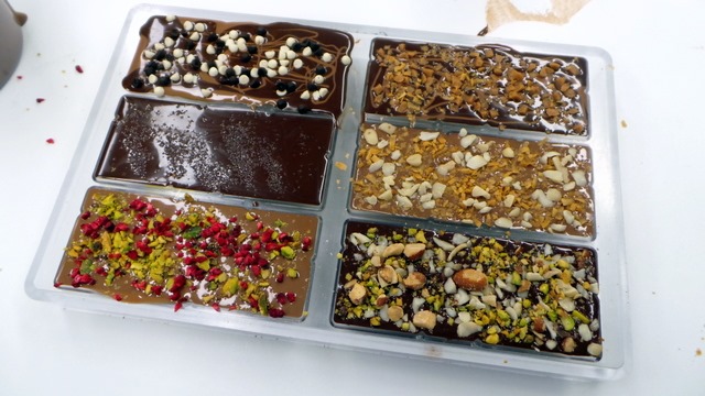 We poured milk and/or dark chocolate into a mold and after placing the molds on a vibrating tray to release any air bubbles in the chocolate, we sprinkled toppings of our choice on top of our bars.