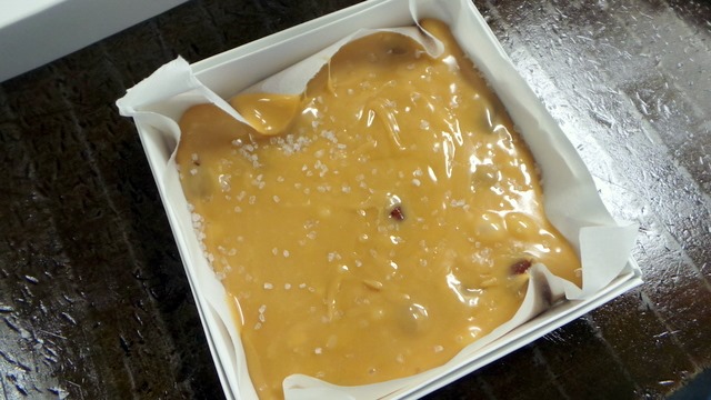 Once the caramel was done, we were able to each take some to pour into a small box and I added roasted almonds and sea salt to my batch.