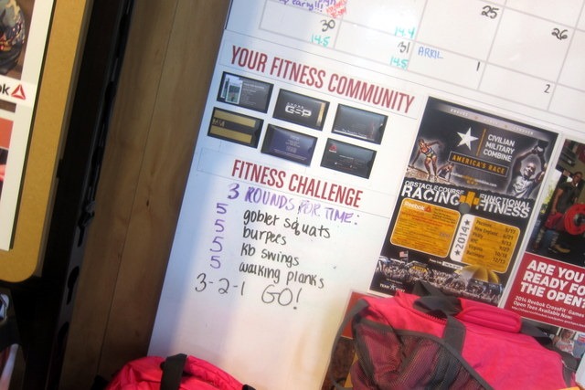 In addition to upcoming events at the store, the calendar listed a Fitness Challenge at the bottom for anyone to pop by and do at any time. The floor of the store is made with the same material featured in the CrossFit box next door, so people can test out shoes in the store and know how they’ll feel at the gym which I thought was neat! The store also has boxes for box jumps, kettlebells and other exercise equipment for customers to use to help them properly test out Reebok footwear and apparel before purchasing.