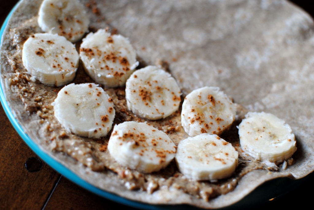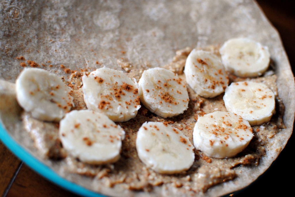 I spread almond butter on half of a tortilla, topped it with banana slices and a sprinkle of cinnamon before folding over the other half and digging in!