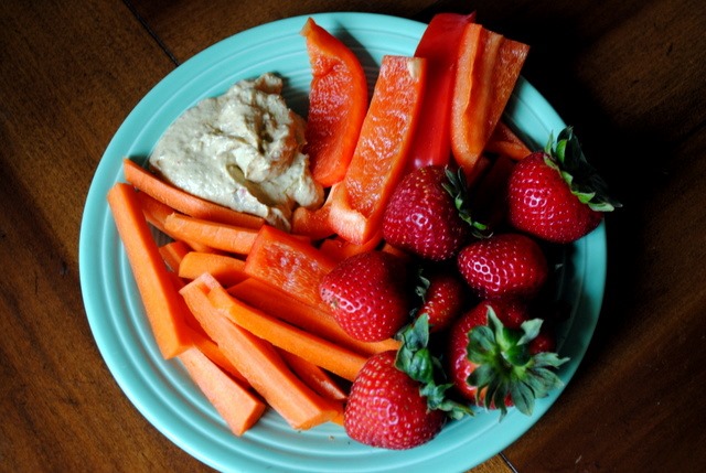 By the time I made it back to our house I was ready for part two of my lunch. I quickly fixed myself a snack plate of veggies with hummus and fresh strawberries.