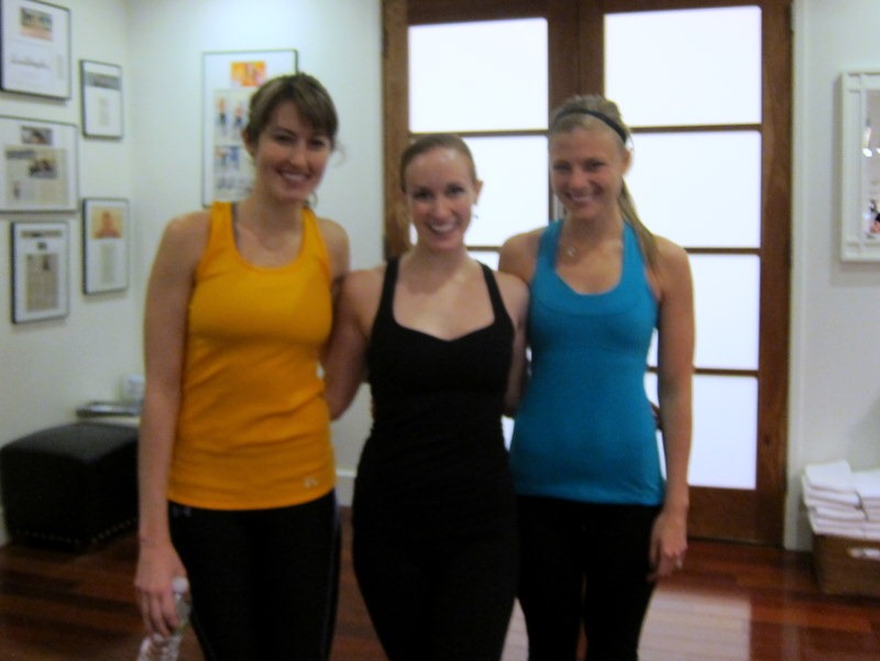 The class did a lot of leg and core work and push ups. Our instructor, Sarah M., (pictured in the middle of me and Merri below) has a background in dance and the power and flexibility she demonstrated in the class was awesome. You can tell the workout pays off for those who do it regularly.