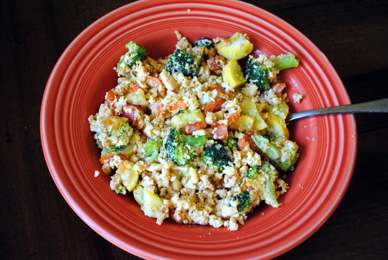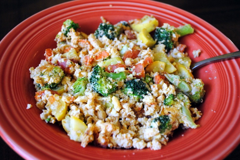 I made a bowl of hummus scrambled eggs with broccoli, tomato, onion and yellow squash.