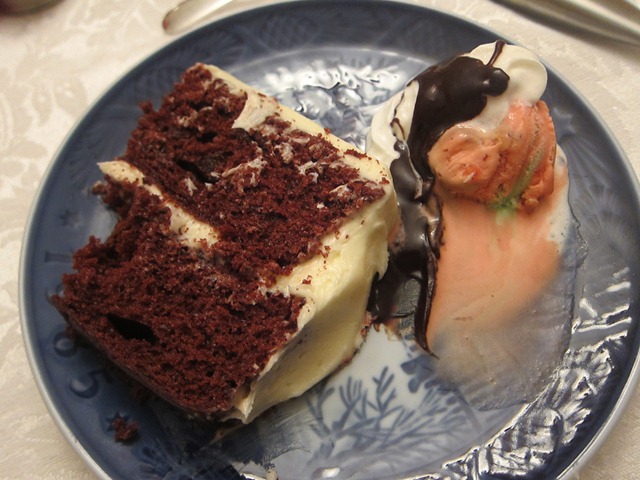 We had red velvet cake with ice cream, whipped cream and my mom’s homemade chocolate sauce. Phenomenal! You can’t go wrong with cake and ice cream.