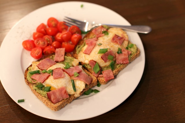 I was craving something on the savory side and ended up making myself a plate of toast topped with guacamole, two fried eggs, turkey bacon and green onion. I served it up with a side of sliced cherry tomatoes in an effort to add a little color and lycopene to my plate.