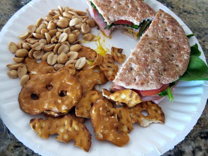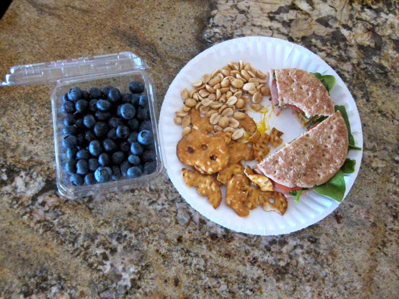 Then it was time to make myself a ham sandwich on a whole wheat sandwich thin which I ate with a side of pretzel crisps, roasted peanuts and fresh blueberries.