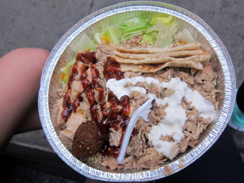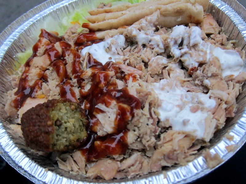 I got the rice and pita bread bowl topped with chicken and added BBQ sauce and their white sauce before digging in.