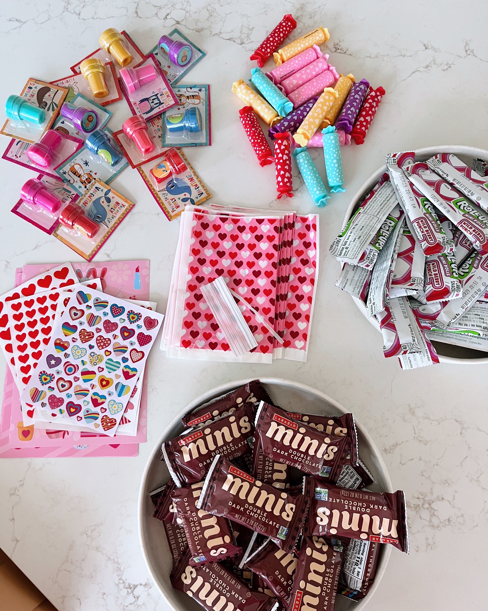 After playing with their gifts and eating lunch, Ryan took Chase back out for a birthday party while Rhett, Ryder and I finished their school valentines and made a white chocolate snack mix to divide up to include with some small gift baskets for their teachers.