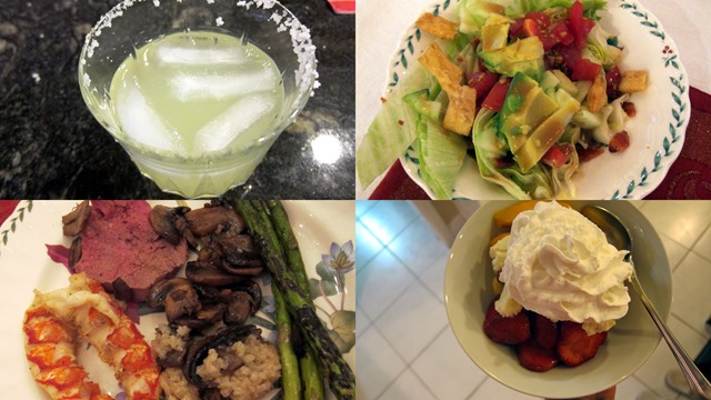 Last night’s dinner began with margaritas and a salad topped with avocado, tomato, bacon and ginger dressing.