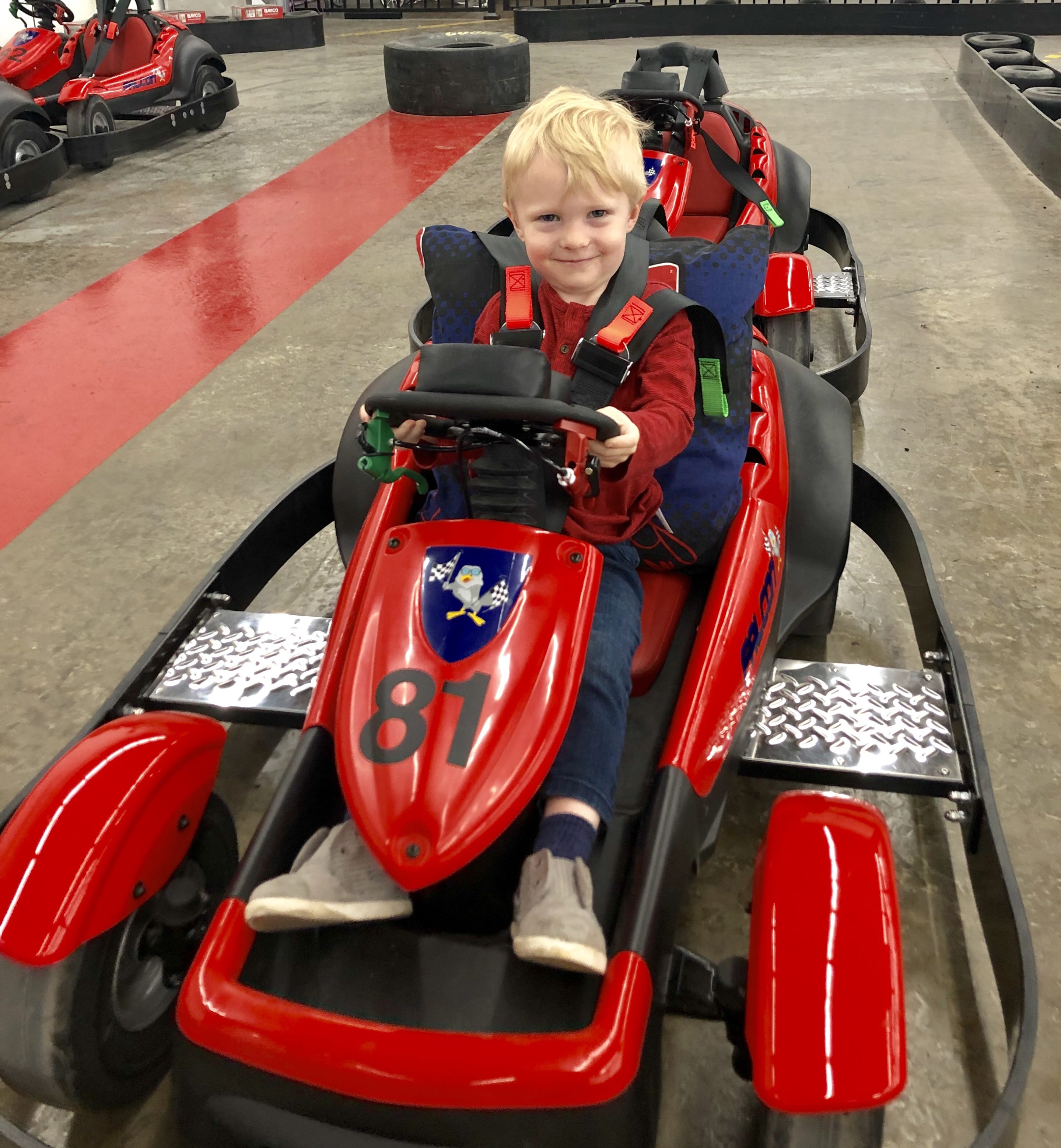I wasn’t sure what to expect from Chase’s first go kart experience but since he’s never driven anything like a go kart before, I thought there would be a pretty steep learning curve. Boy was I wrong! He took to that thing like a fish to water and barely needed any instruction at all. He was in heaven on the peanut track and it was adorable to see him so into driving his go kart. Just look at his mischievous little grin…