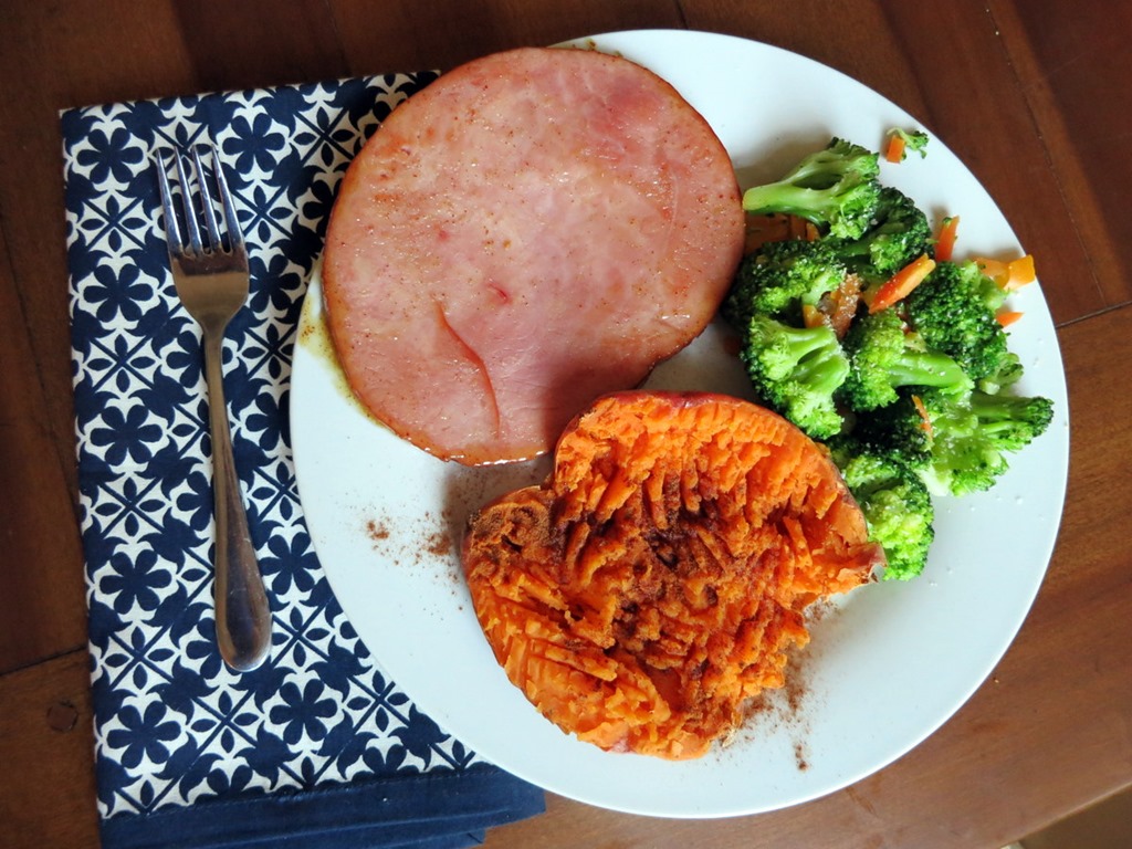 After trying on the wig, we sat down to a simple dinner that included steamed veggies with garlic salt, sweet potatoes topped with cinnamon and a drizzle of maple syrup and ham steaks cooked in a glaze that I made with spicy mustard and maple syrup.