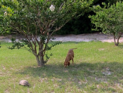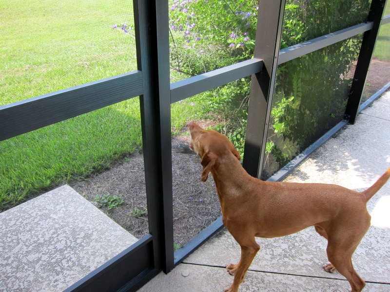 She has a habit of pacing around the porch, smelling the air and irrationally freaking out over Bob Barker, the floating pool toy. This evening, however, she went bananas and started barking excessively while pointing outside like the little huntress she was bred to be.
