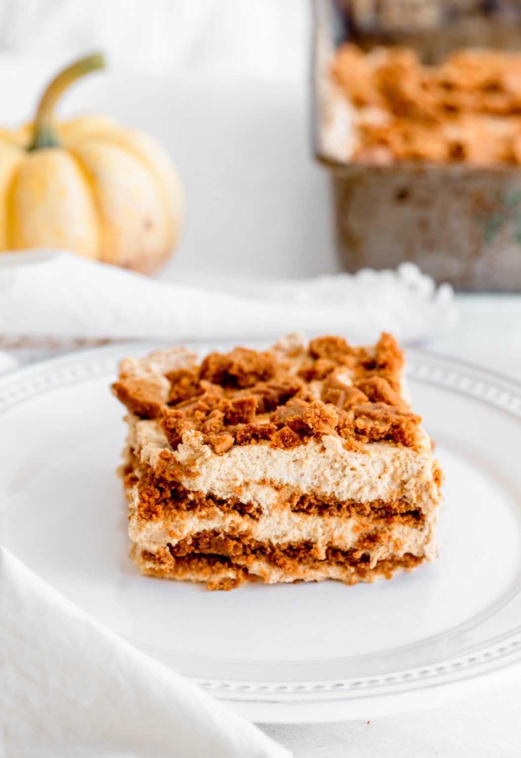 This Pumpkin Icebox Cake is a sweet and creamy dessert that is easy to make and overflowing with cinnamon and pumpkin flavor. Simply whip up a batch of homemade cinnamon pumpkin whipped cream and layer it with Biscoff cookies for a festive fall dessert everyone will love!