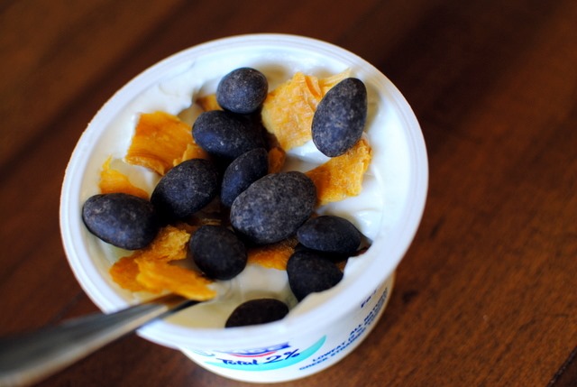 Part one: Greek yogurt topped with dried mango and dark cocoa almonds