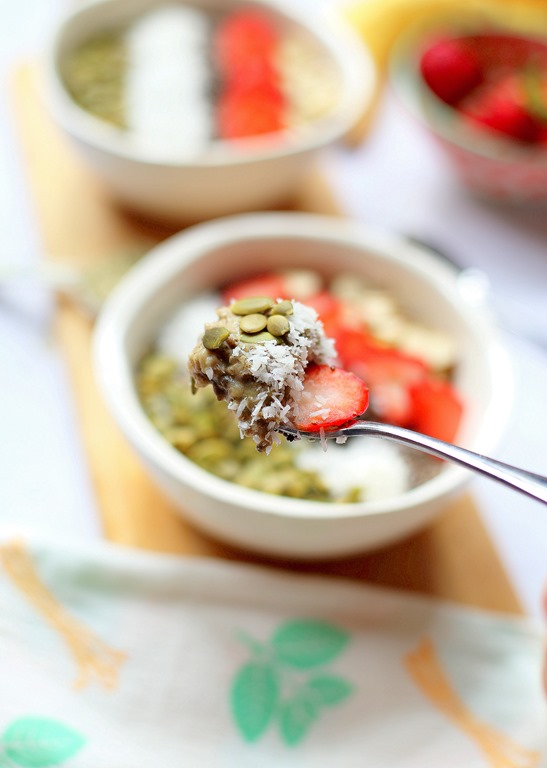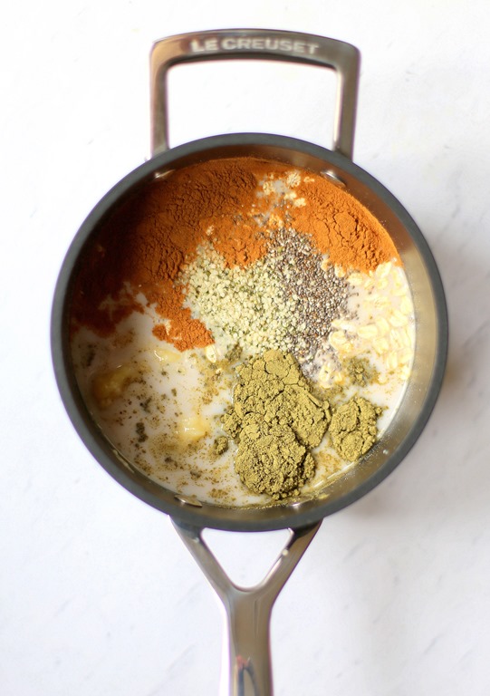 And don’t forget to add your favorite toppings to this warm and comforting bowl of oatmeal. (Tip: Toppings are key to making this oatmeal look appetizing. Green hemp protein powder + Beige oatmeal = Not a recipe for an attractive breakfast.)
