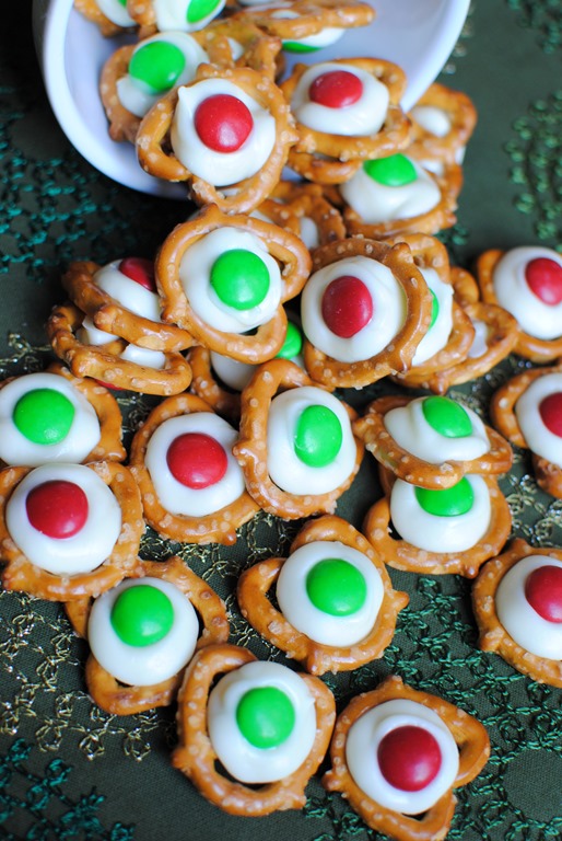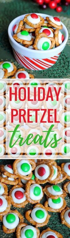 It’s a treat that’s both salty and sweet and oh-so-festive thanks to crispy pretzels and red and green M&Ms.