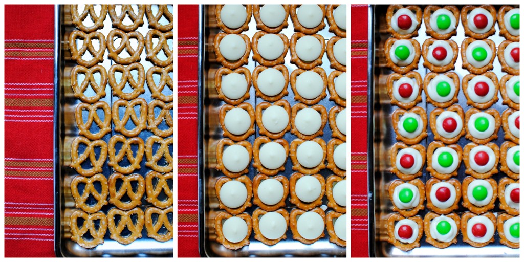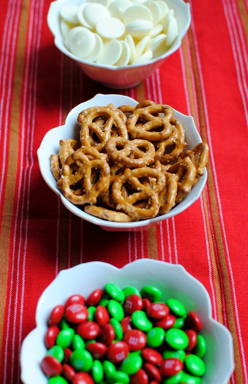 You only need three ingredients to make these holiday pretzels: White chocolate wafers (you can find these at some grocery stores and most craft stores), pretzels and M&Ms.