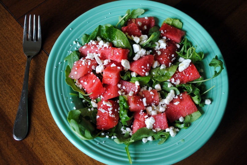 Today’s salad was a repeat of my watermelon, arugula, spinach and feta salad only this time I used salt and olive oil rather than a pomegranate dressing.