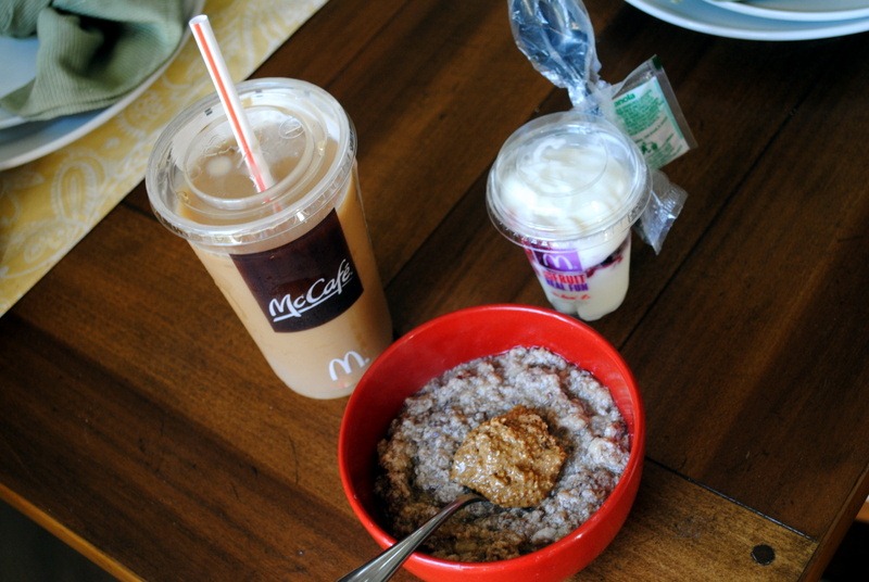 I ordered an iced coffee and a fruit ‘n’ yogurt parfait to eat at home with a bowl of steel cut oats that I pumped up with egg whites, banana and flaxseeds.