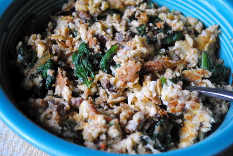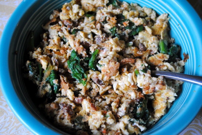 I stirred a few crumbled Wildwood veggie meatballs, chopped spinach and shredded mozzarella cheese into the eggs as they were cooking and the result was a rather delicious breakfast bowl.