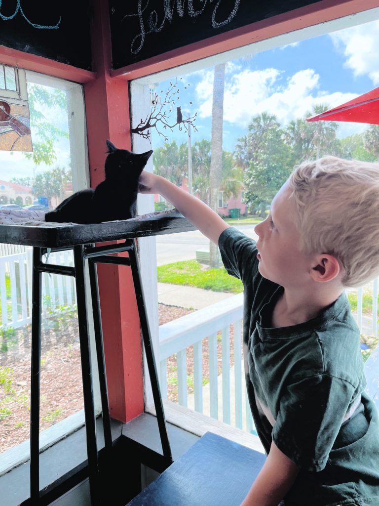 My mom recently heard about The Caffeinated Cat and thought it would appeal to our boys and she was spot-on! The Caffeinated Cat is a little café located in Jacksonville Beach that is home to some “wonky cats” (their words), many of whom need a little extra medical attention and love. (Many are also up for adoption should you wish to add one of these sweet cats to your family!) We walked over to the café with my sister and nieces one weekday morning which I’d recommend because we were the only people there and spent a lot of time with the cats before ordering our drinks and donating to the café which relies heavily on donations to care for their cats.
