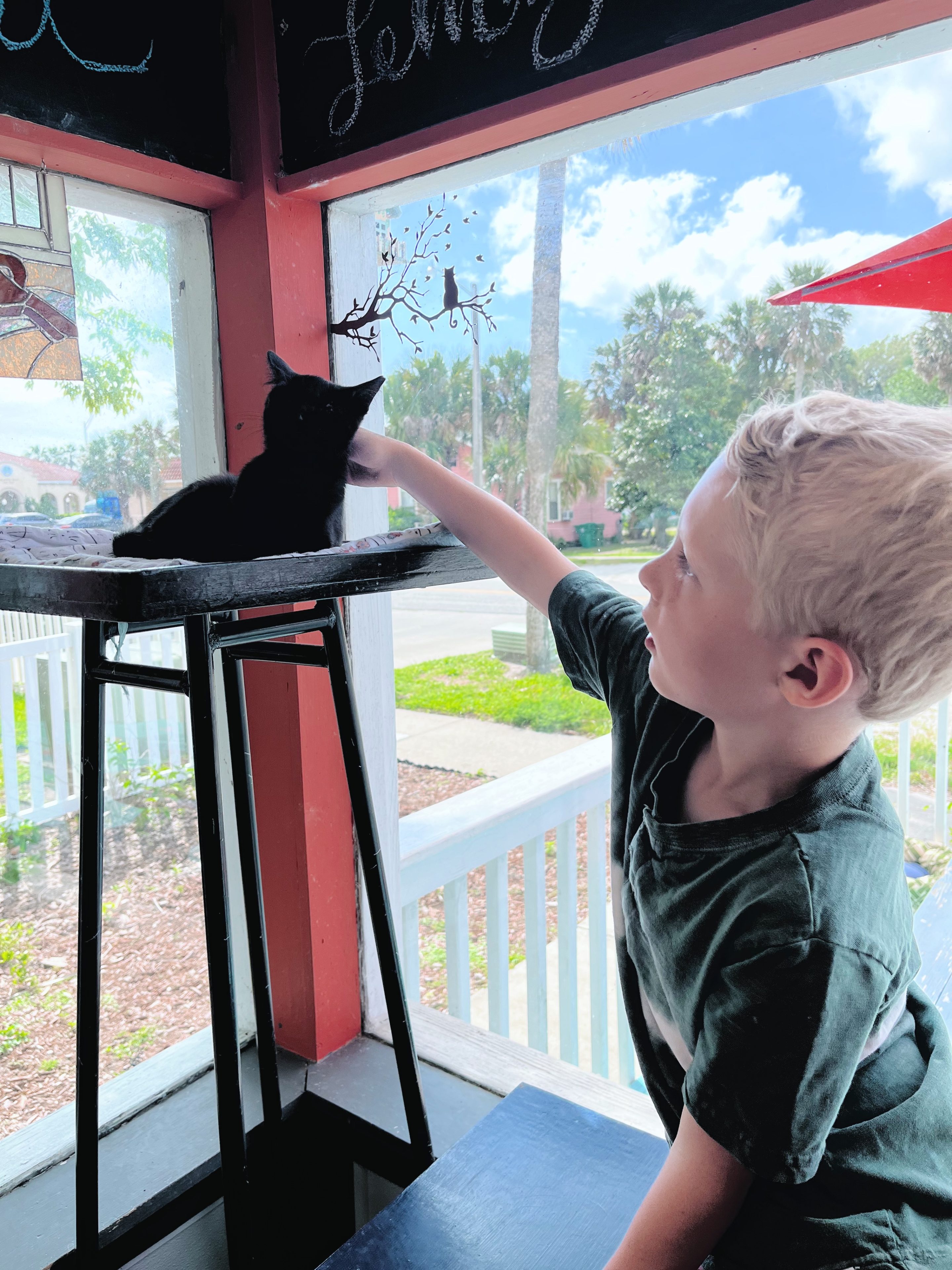 My mom recently heard about The Caffeinated Cat and thought it would appeal to our boys and she was spot-on! The Caffeinated Cat is a little café located in Jacksonville Beach that is home to some “wonky cats” (their words), many of whom need a little extra medical attention and love. (Many are also up for adoption should you wish to add one of these sweet cats to your family!) We walked over to the café with my sister and nieces one weekday morning which I’d recommend because we were the only people there and spent a lot of time with the cats before ordering our drinks and donating to the café which relies heavily on donations to care for their cats.