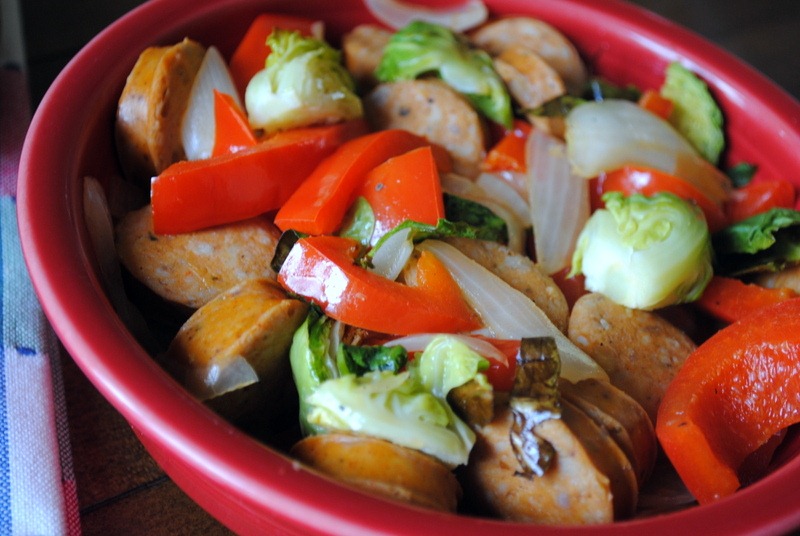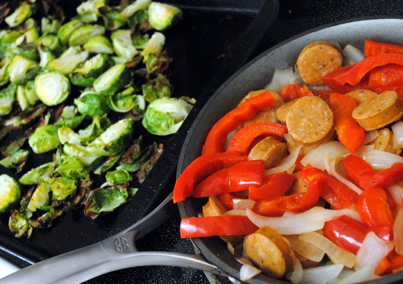 Lunch included roasted Brussels sprouts paired with sautéed peppers, onions and al fresco chipotle chorizo sausage.