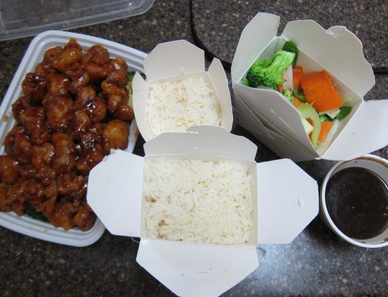 Once we settled on a cuisine, we stopped by a local take-out place and ordered General Tso’s chicken and steamed vegetables with rice to share.