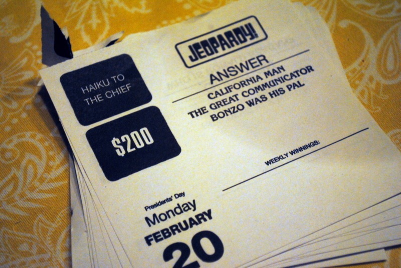 I did pretty well on the “Haiku to the Chief” category, which I think would make my President-loving friend Heather pretty proud. (The answer to the above question is Reagan, in case you were wondering or wanted to see if you were right. I did a president report on him in sixth grade!)