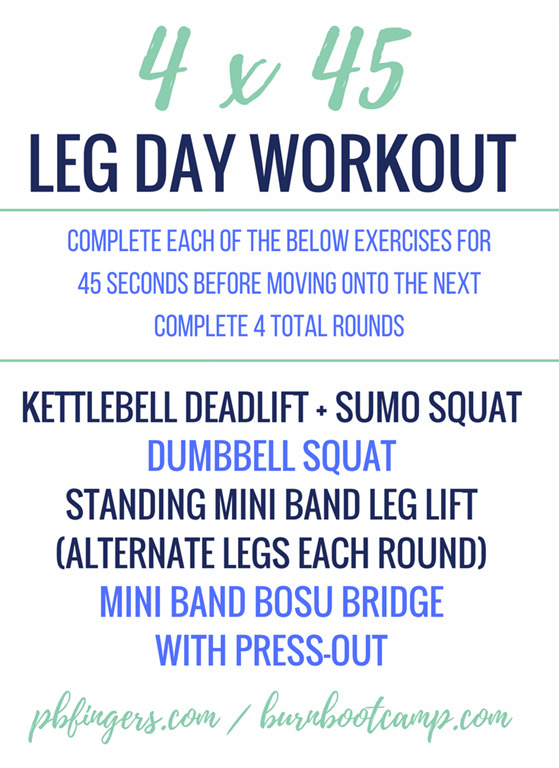 The Burn Boot Camp protocol called for a leg workout and we paired off in groups of four to complete a lower body burner. Here’s what my slightly-modified version looked like: