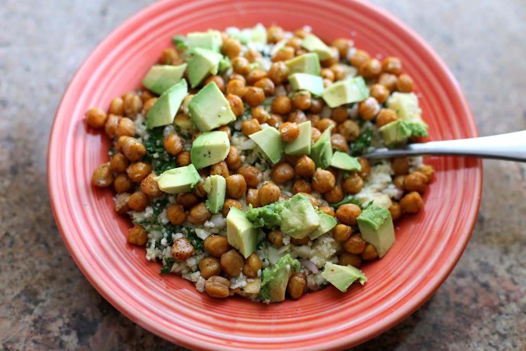 Dinner was a rather random assortment of leftovers – rice, cauliflower, cheese, cilantro, onions and roasted chickpeas – all thrown together in a bowl and topped with avocado.